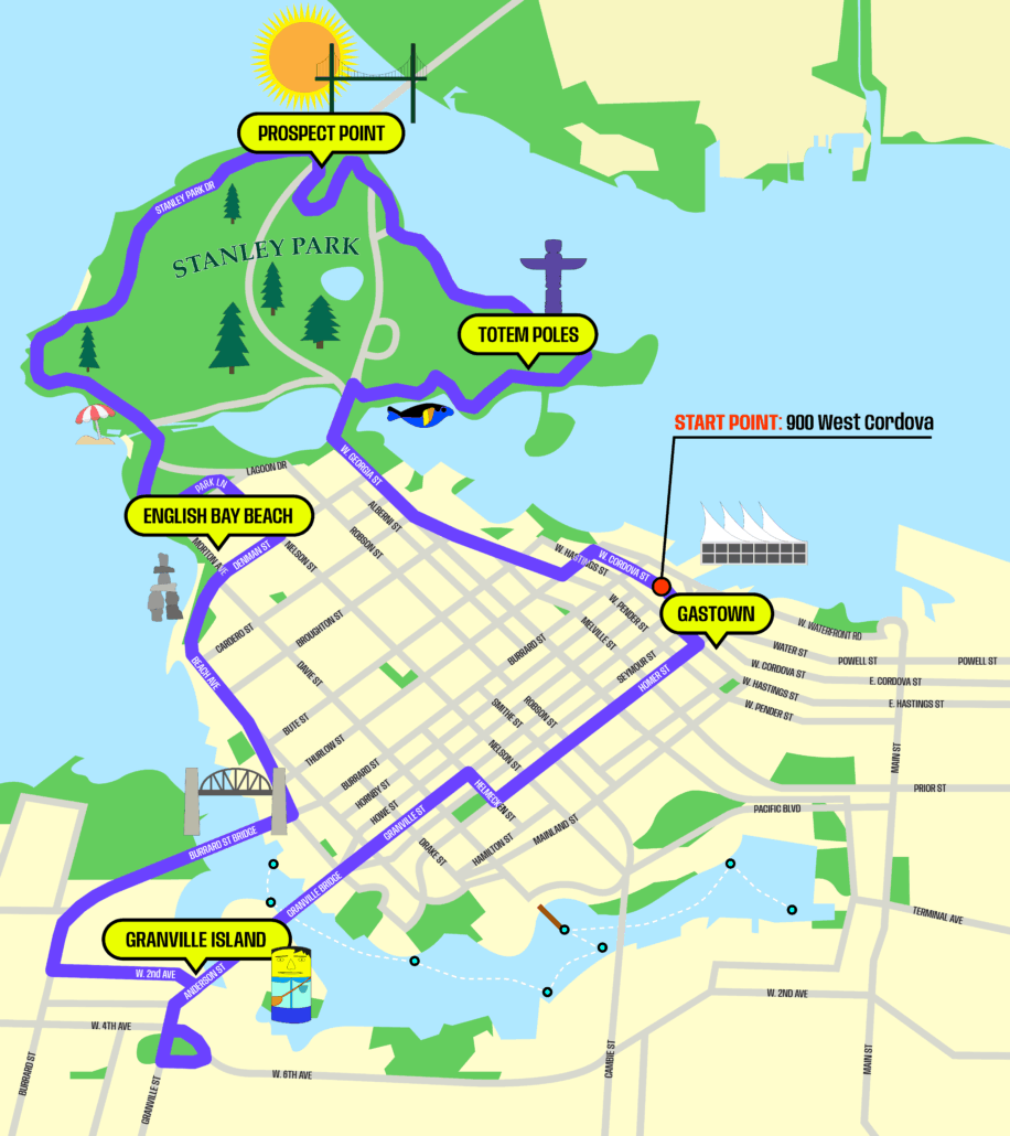 At any of our stops throughout our route. Please note that on Sundays, all stop 1 departures are from 900 West Cordova Street instead of Canada Place!